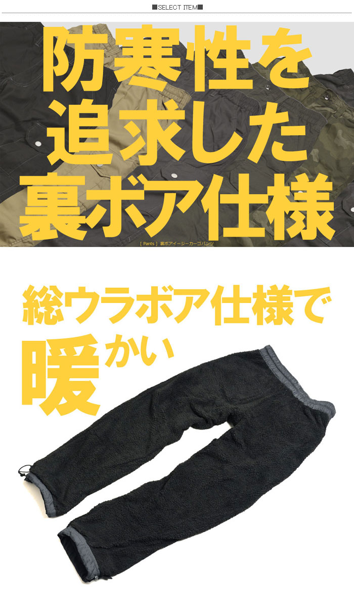 イージーなカーゴパンツに防寒性を極限まで高めた裏ボア使用のパンツです。