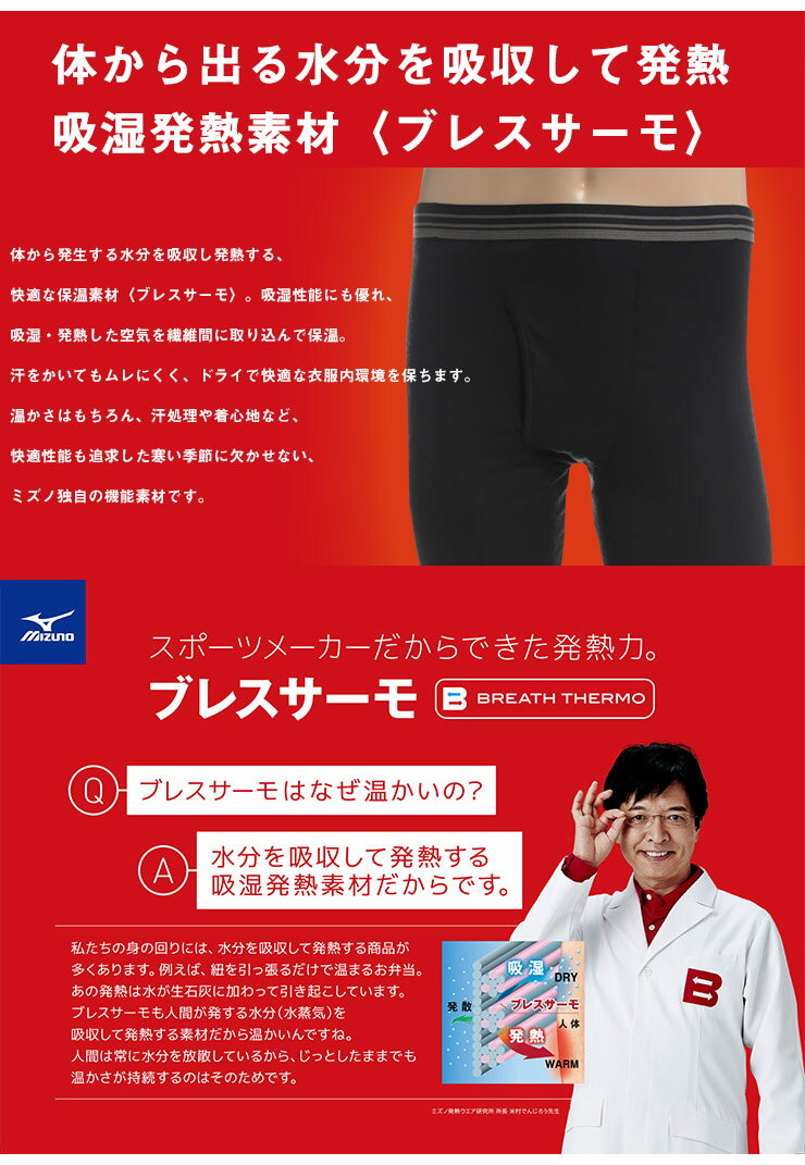 大きいサイズ メンズ MIZUNO (ミズノ) 秋冬対応 ブレスサーモ 無地 アンダー ロングタイツ [3L-6L] サカゼン ビジネス カジュアル アンダーウェア 下着 肌着 消臭 防寒 発熱 保温 着心地 吸湿発熱素材のブレスサーモ搭載のタイツです。